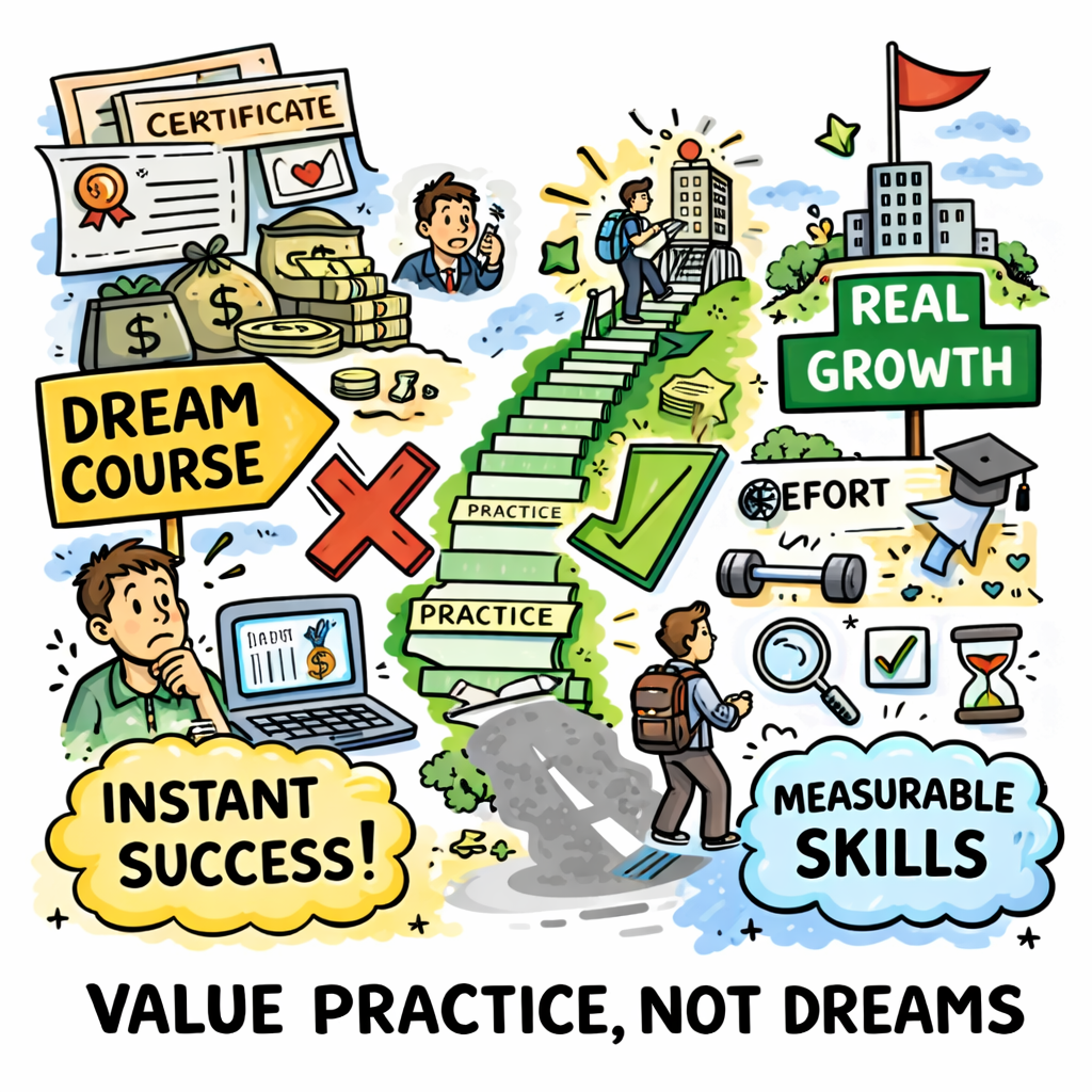 Any course that offers dreams instead of skills that can be measured should be looked at with suspicion right away. Certificates alone do not build careers, and no real education can turn hard work, practice, and experience into a sure thing. Real growth comes from practicing regularly, putting what you have learnt to use, and getting information from sources that you can check yourself. Anything that says otherwise is just selling hope, not skill.