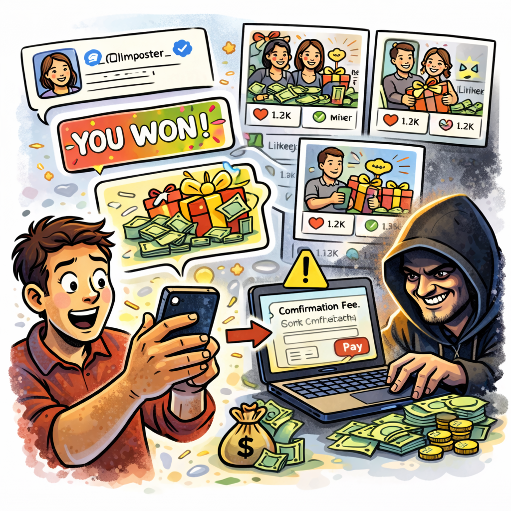 As I browse through social media, it seems like a regular occurrence to come across posts about giveaways, prize draws, or lottery victories. Messages that say things like “you’ve been selected,” “congratulations, you’re the winner,” or “claim your reward now” can be found in comments, direct messages, and even from profiles that seem verified.
