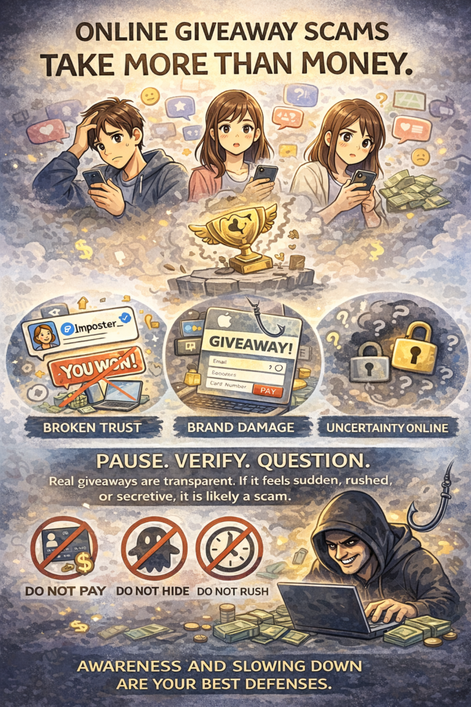 Giveaway and lotto scams do more than just take your money. They slowly hurt the trust between influencers and the people who follow them, hurt the reputation of real brands whose identities are used fraudulently over and over, and make people less confident in digital places. Over time, this makes the internet a place where doubt takes the place of interest and even real possibilities are questioned.